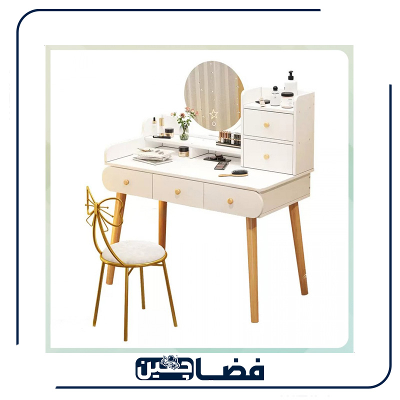 میز آرایش مدل FZ214: ترکیبی از زیبایی، دوام و کارایی با صندلی پاپیونی، کشوهای ساچمهای و پایههای چوبی
