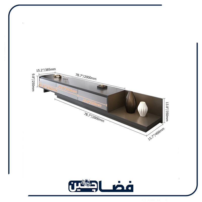 - طول ۲۱۰ سانتیمتر: این طول بلند و چشمگیر، فضایی بسیار مناسب برای قرار دادن تلویزیونهای سایز بزرگ را فراهم میکند و به شما امکان میدهد تا دکوراسیونهای جانبی، اسپیکرها یا لوازم دکوری خود را نیز در کنار تلویزیون به زیبایی بچینید. این طول، همچنین به ایجاد حسی از پهنا و وسعت در فضای نشیمن کمک میکند.